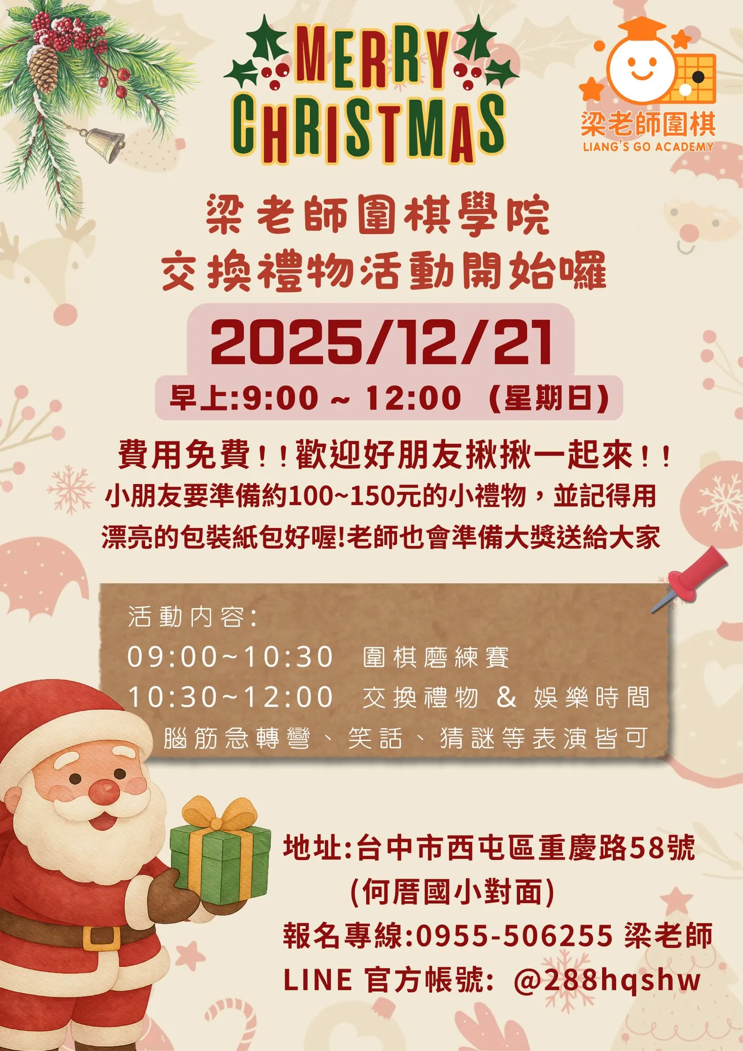 最新消息聖誕節交換禮物活動來囉!活動完全免費,歡迎邀請好朋友一起來參加! 台中圍棋∣台中圍棋教室